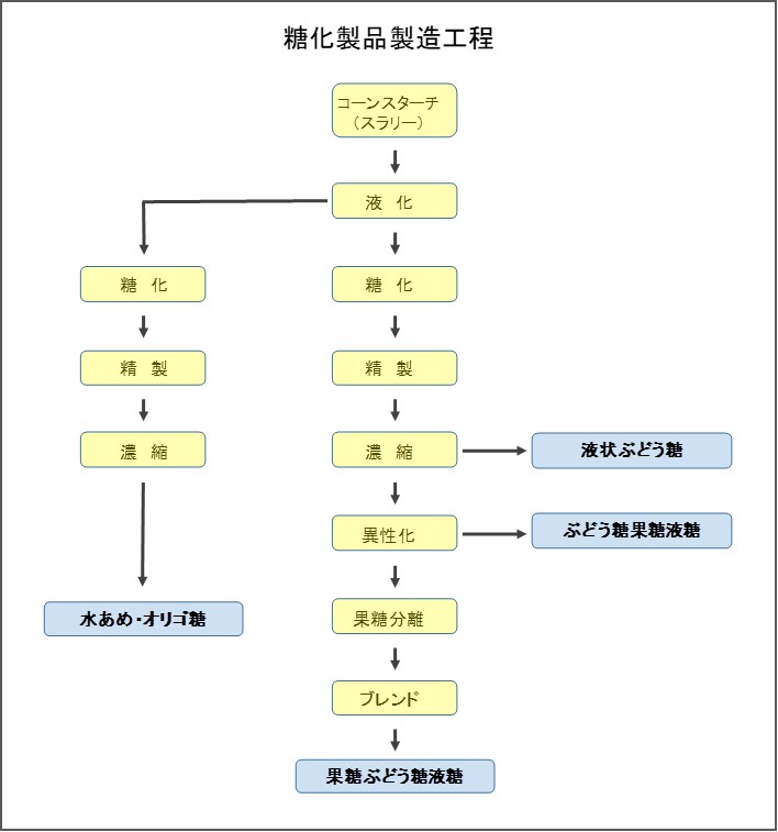 「コーンスターチ」から作られる「水あめ」「ぶどう糖液」「異性化糖」